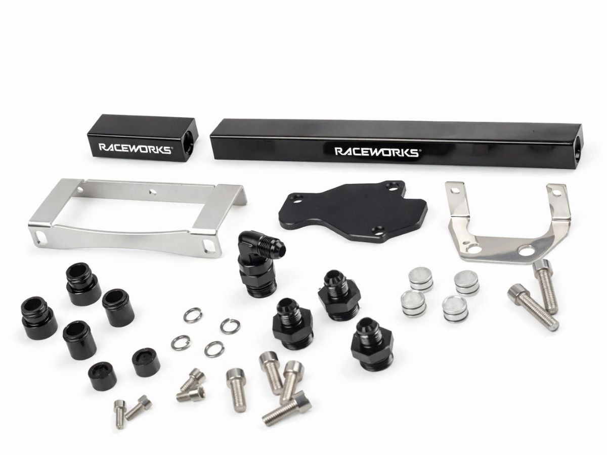 Mounting Hardware As Pictured. Rails Have AN-8 ORB on Ends. Included fittings are AN-6 Male Flare Adapters x4. Rails suit Full Length Injectors with 14mm Top O-Rings.